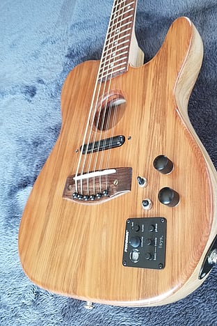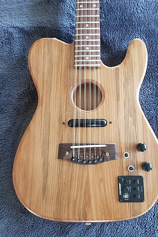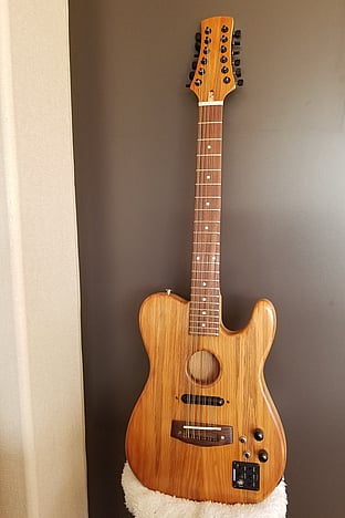 "Back in 1987, while on a sailing trip in the Mediterranean, I got inspired to build acoustic guitars featuring a tear-drop shape. This style was among the ancestors of modern guitars, and were known in England as Citerns, and in Spain as Lauds. I have always preferred the full, harmonious sound of 12-string guitars, and have built a number of these over the decades. My latest build is a hybrid 12-string, which looks like a hollow-body telecaster, but carries pickups that can produce both acoustic and jangly 60’s sounds. With so many guitars around the house now, like Greg I have had to promise my wife this latest hybrid will be my last build!"
