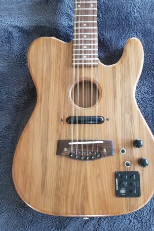 "Back in 1987, while on a sailing trip in the Mediterranean, I got inspired to build acoustic guitars featuring a tear-drop shape. This style was among the ancestors of modern guitars, and were known in England as Citerns, and in Spain as Lauds. I have always preferred the full, harmonious sound of 12-string guitars, and have built a number of these over the decades. My latest build is a hybrid 12-string, which looks like a hollow-body telecaster, but carries pickups that can produce both acoustic and jangly 60’s sounds. With so many guitars around the house now, like Greg I have had to promise my wife this latest hybrid will be my last build!"